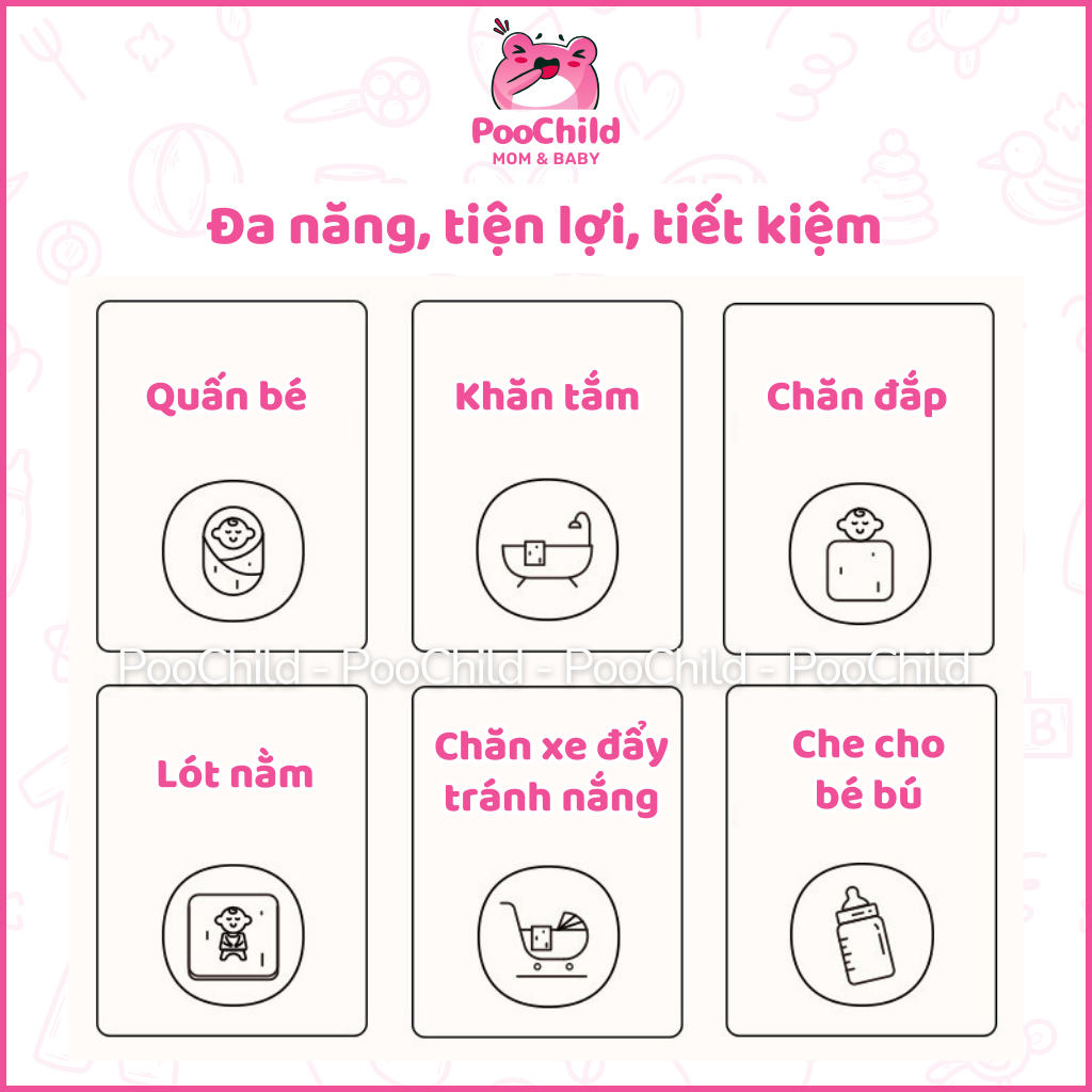 – Đa chức năng: khăn tắm, chăn đắp, khăn trải giường, quấn bé, chăn xe đẩy, khăn che tránh nắng cho bé,…