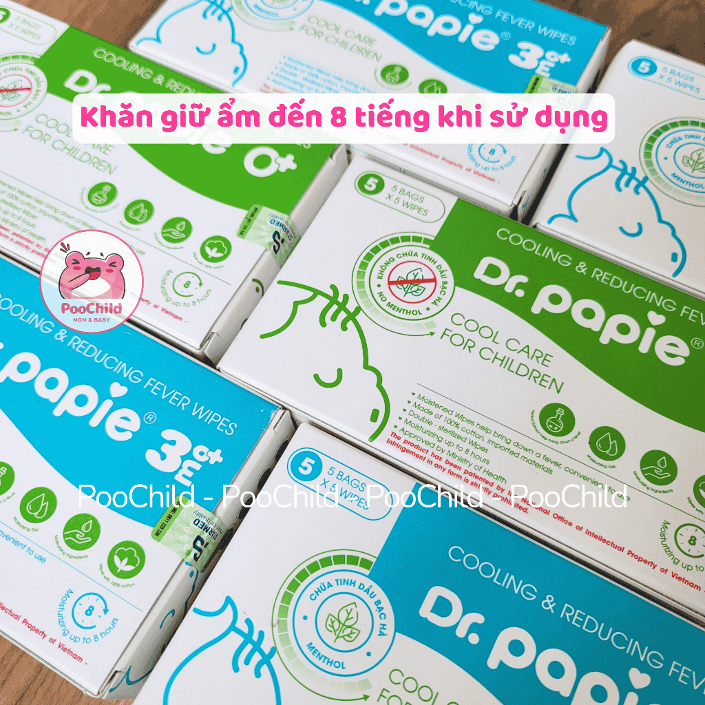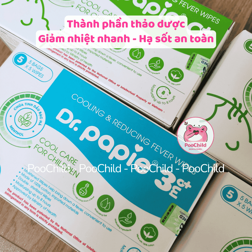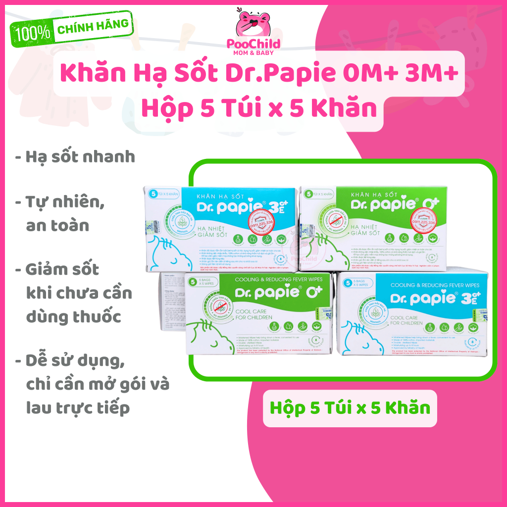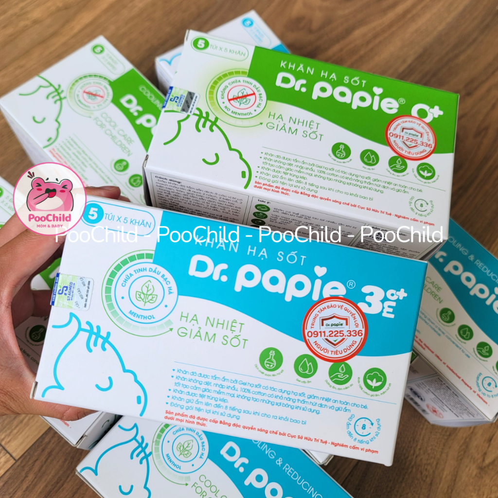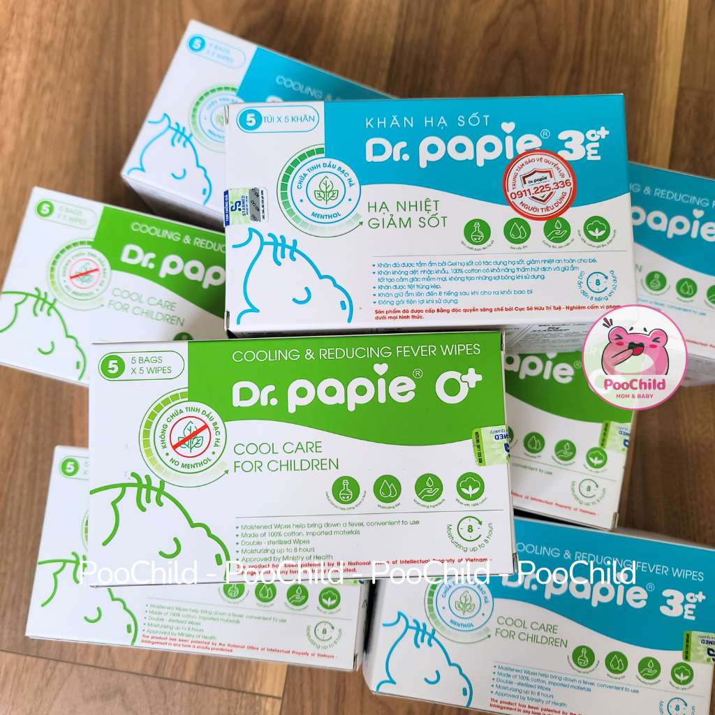 Khăn lau hạ sốt Dr Papie cho bé từ sơ sinh, khăn hạ sốt 0M+ 3M+ thải nhiệt ngăn ngừa co giật cho bé hộp 5 gói x 5 khăn/gói